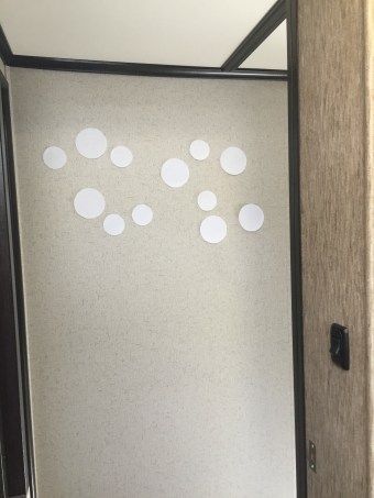 Our “house” is a 2015 Grand Design Momentum 385TH (aka a big fifth wheel camper with a garage in the back-here’s a tour of it if you’re interested). Outside the bathroom there is just a blank wall. I personally think they should’ve put a window there, but I didn’t build the thing. I’ve had my eye on these mirrored wall decorations for quite a while now.