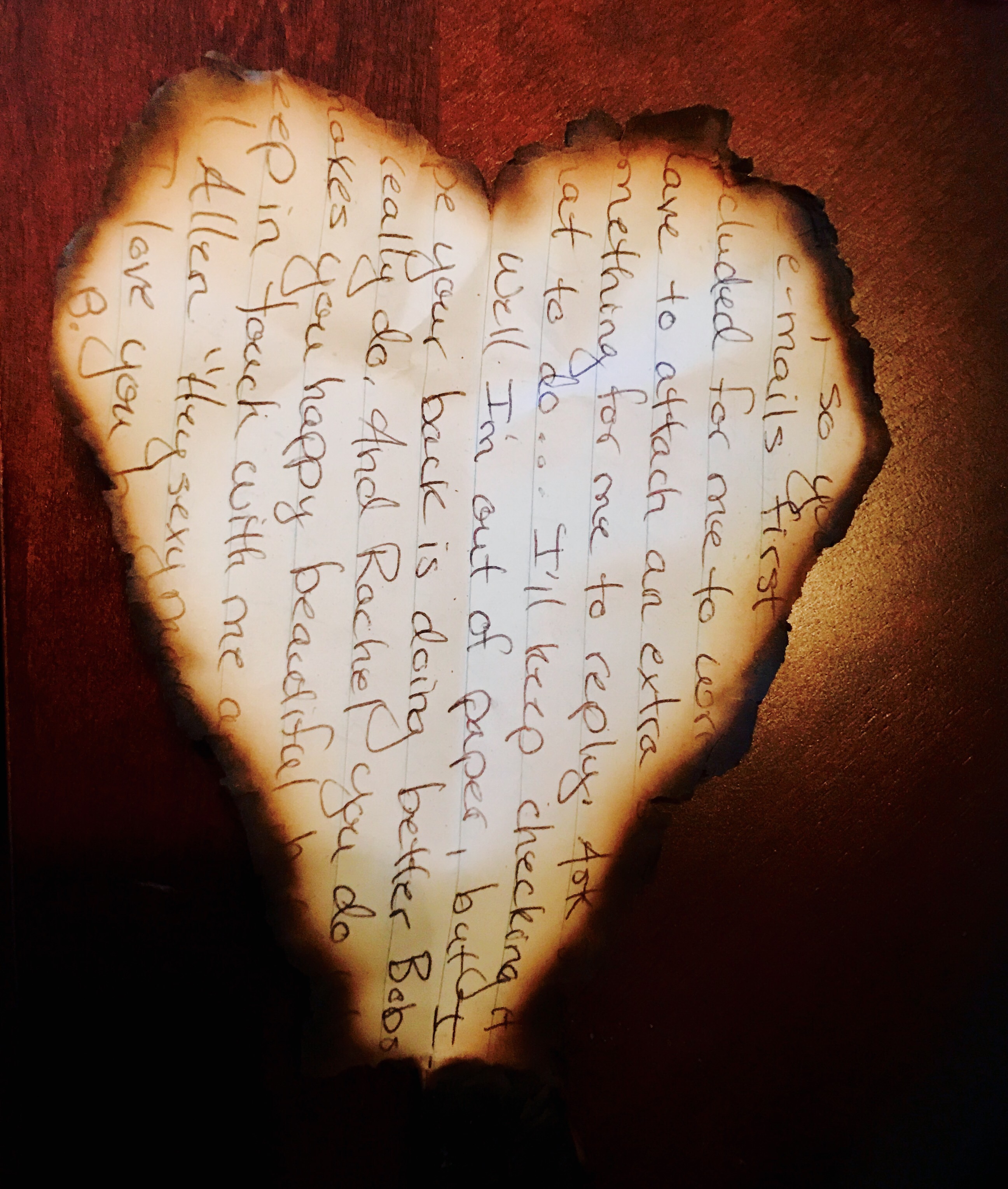 When we were burning old bills, one of the letters my brother had written me accidentally got mixed in. I managed to get it out of the fire, and when it stopped burning, it was in the shape of a heart…