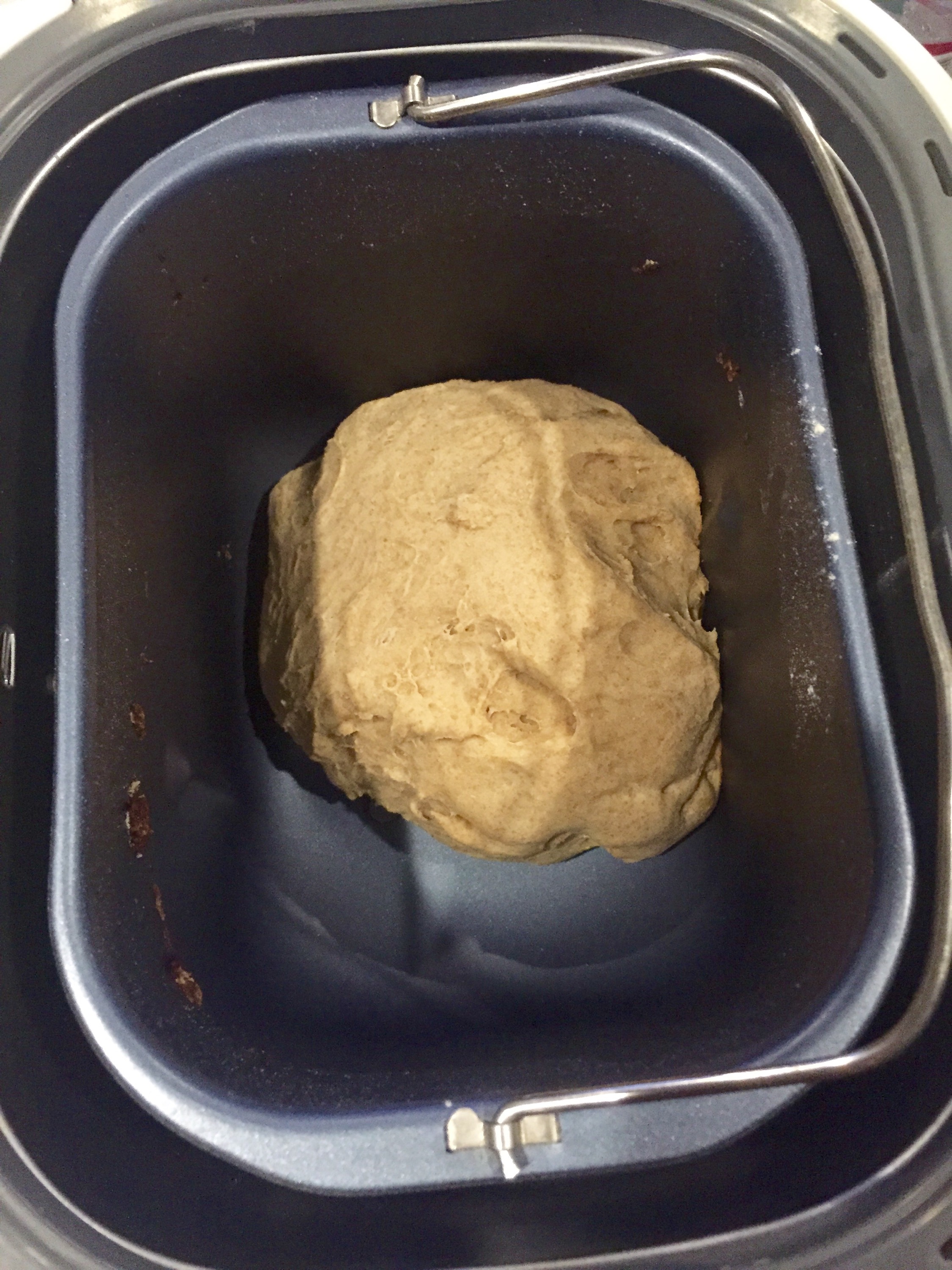 Once I added all the ingredients and the cycle started and the machine started to knead the bread and work its magic, I quickly realized there wasn’t nearly enough liquid. So I stopped the cycle. I added some more lemonade concentrate, then some water. I restarted the cycle, it was too wet so I sprinkled some flour. I finally got the dough ball looking relatively normal. So I stopped fretting and cleaned up.